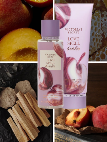 - Ароматична композиція Love Spell Brûlée: медовий цвіт, персик, підсолоджений сандал.
